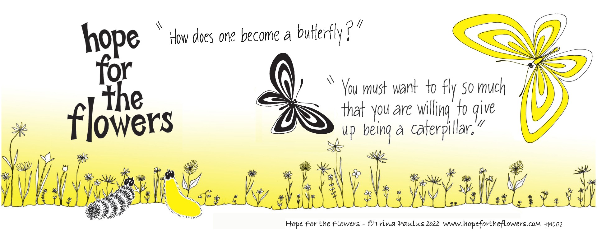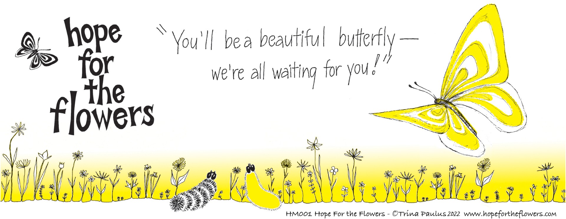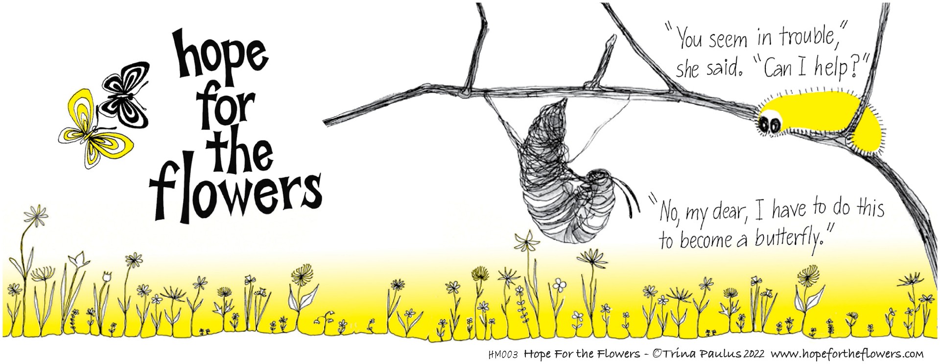 Over half a century ago, in March of 1970, Trina Paulus was working on a different book about Hope. One day the two caterpillars on the cover seemed to ask for their own story. That day 90% of Hope for the Flowers was written.